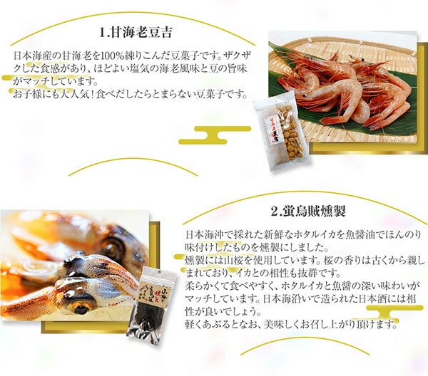 甘海老豆吉、蛍烏賊燻製、チェダーチーズとかんずり入さきいか