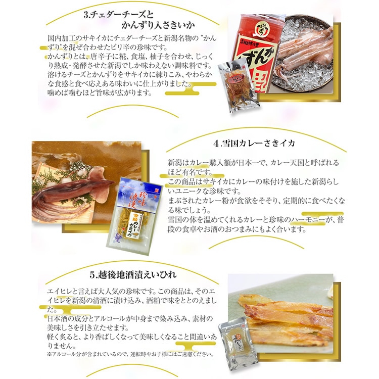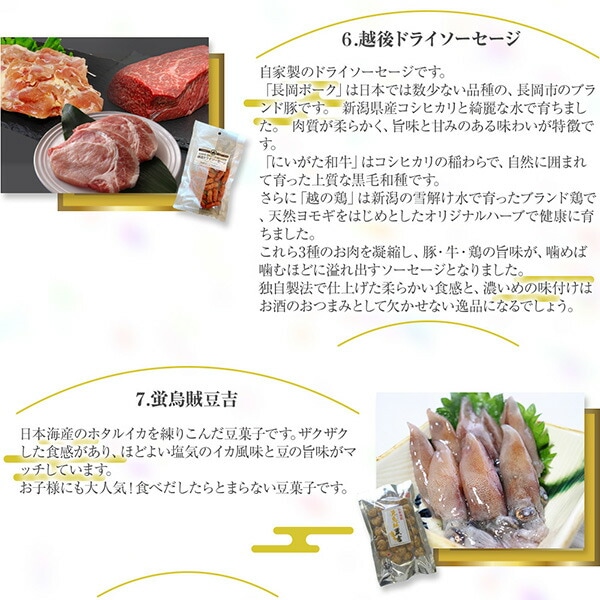 雪国カレーさきイカ、越後地酒漬えいひれ、越後ドライソーセージ、蛍烏賊豆吉