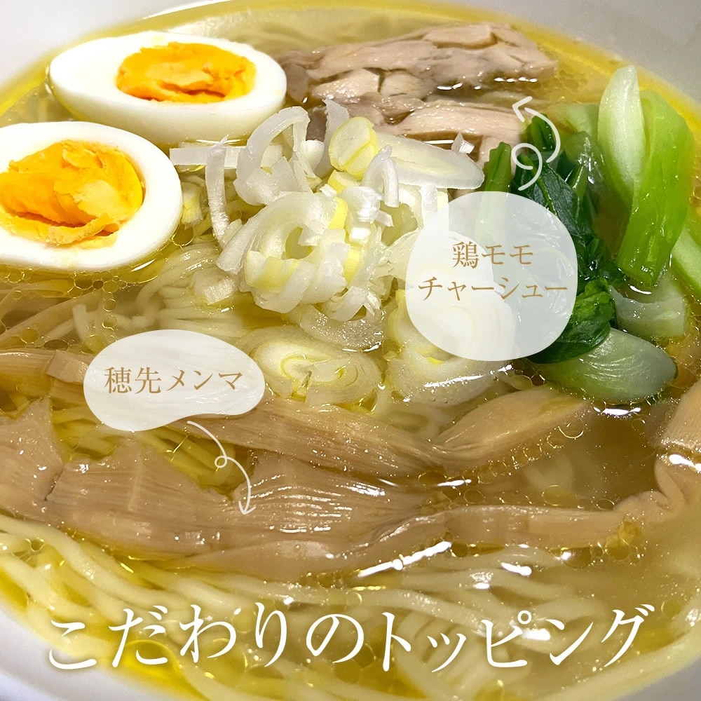 鶏ガラ、モミジ、昆布等を、スープが濁らない温度でじっくりと炊き上げた鶏清湯スープに貝出汁の塩ダレを加えて旨味を引き出します。